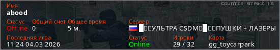 Играет на Counter Strike 1.6 сервере. Страна: РоссияПервый раз замечен 11:22 04.03.2026