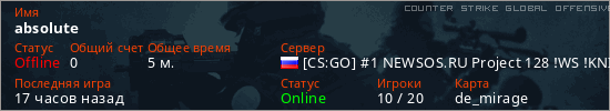 Играет на Counter Strike Global Offensive сервере. Страна: РоссияПервый раз замечен 19:23 11.03.2026