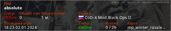 Играет на Call of Duty 4: Modern Warfare сервере. Страна: РоссияПервый раз замечен 18:17 02.01.2024