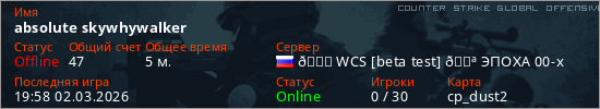 Играет на Counter Strike Global Offensive сервере. Страна: РоссияПервый раз замечен 19:51 02.03.2026