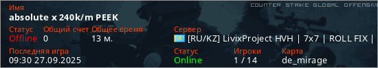 Последний раз был в сети 09:30 27.09.2025 Игрок с таким ником замечен на 14 серверах