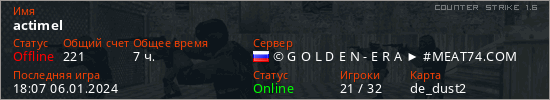 Играет на Counter Strike 1.6 сервере. Страна: РоссияПервый раз замечен 08:59 16.01.2023
