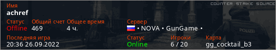 Играет на Counter Strike Source сервере. Страна: РоссияПервый раз замечен 14:09 20.09.2022