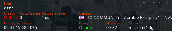 Играет на Counter Strike 1.6 сервере. Страна: СШАПервый раз замечен 06:30 15.08.2025