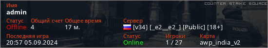 Играет на Counter Strike Source сервере. Страна: РоссияПервый раз замечен 17:06 01.01.2024