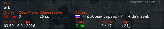 Играет на Counter Strike 1.6 сервере. Страна: РоссияПервый раз замечен 04:02 15.01.2026