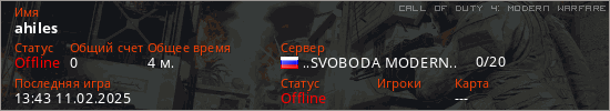 Играет на Call of Duty 4: Modern Warfare сервере. Страна: РоссияПервый раз замечен 13:36 11.02.2025