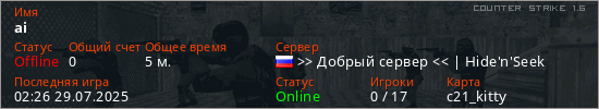 Играет на Counter Strike 1.6 сервере. Страна: РоссияПервый раз замечен 02:14 29.07.2025