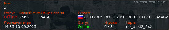 Играет на Counter Strike 1.6 сервере. Страна: РоссияПервый раз замечен 00:20 10.10.2021