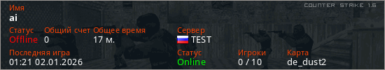 Играет на Counter Strike 1.6 сервере. Страна: РоссияПервый раз замечен 19:54 01.01.2026