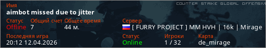 Играет на Counter Strike Global Offensive сервере. Страна: РоссияПервый раз замечен 13:32 21.03.2026