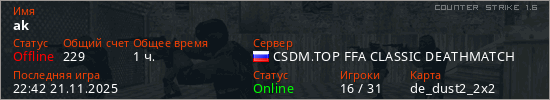 Играет на Counter Strike 1.6 сервере. Страна: РоссияПервый раз замечен 19:50 16.10.2021