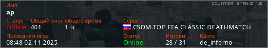 Играет на Counter Strike 1.6 сервере. Страна: РоссияПервый раз замечен 08:45 15.05.2020