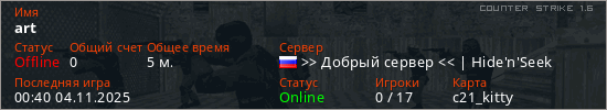 Играет на Counter Strike 1.6 сервере. Страна: РоссияПервый раз замечен 00:34 04.11.2025