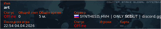 Играет на Counter Strike Global Offensive сервере. Страна: РоссияПервый раз замечен 22:47 04.04.2026