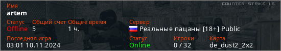 Играет на Counter Strike 1.6 сервере. Страна: РоссияПервый раз замечен 17:26 25.03.2023