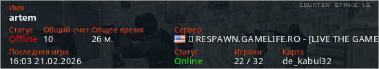 Играет на Counter Strike 1.6 сервере. Страна: СШАПервый раз замечен 16:23 20.02.2026