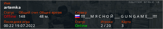 Играет на Counter Strike 1.6 сервере. Страна: РоссияПервый раз замечен 23:37 18.07.2022