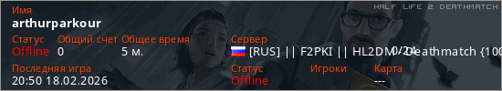 Играет на Half Life 2 DeathMatch сервере. Страна: РоссияПервый раз замечен 20:12 18.02.2026