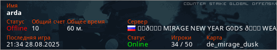 Играет на Counter Strike Global Offensive сервере. Страна: РоссияПервый раз замечен 23:01 13.08.2025