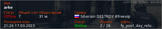 Играет на Counter Strike Source сервере. Страна: РоссияПервый раз замечен 20:57 17.03.2023