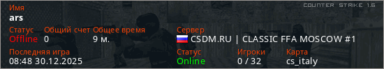 Играет на Counter Strike 1.6 сервере. Страна: РоссияПервый раз замечен 18:08 27.12.2025