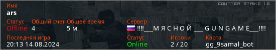 Играет на Counter Strike 1.6 сервере. Страна: РоссияПервый раз замечен 20:07 14.08.2024