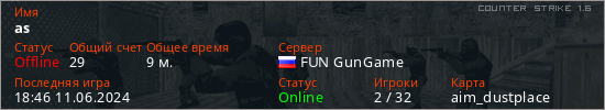 Играет на Counter Strike 1.6 сервере. Страна: РоссияПервый раз замечен 13:53 18.06.2023