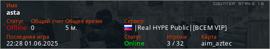 Играет на Counter Strike 1.6 сервере. Страна: РоссияПервый раз замечен 22:26 01.06.2025