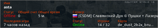 Играет на Counter Strike 1.6 сервере. Страна: РоссияПервый раз замечен 14:36 31.01.2026