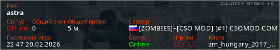 Играет на Counter Strike 1.6 сервере. Страна: РоссияПервый раз замечен 22:45 20.02.2026