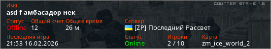 Играет на Counter Strike 1.6 сервере. Страна: УкраинаПервый раз замечен 19:44 16.02.2026