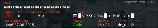 Играет на Counter Strike 1.6 сервере. Страна: РоссияПервый раз замечен 16:33 27.08.2025