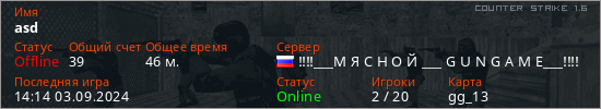 Играет на Counter Strike 1.6 сервере. Страна: РоссияПервый раз замечен 13:20 09.11.2022