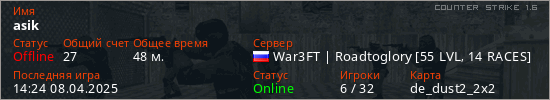 Играет на Counter Strike 1.6 сервере. Страна: РоссияПервый раз замечен 10:54 11.01.2023