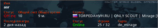 Играет на Counter Strike Global Offensive сервере. Страна: РоссияПервый раз замечен 17:42 06.03.2026