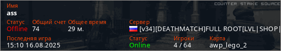 Играет на Counter Strike Source сервере. Страна: РоссияПервый раз замечен 22:04 18.03.2023