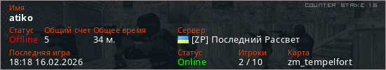 Играет на Counter Strike 1.6 сервере. Страна: УкраинаПервый раз замечен 20:30 13.02.2026