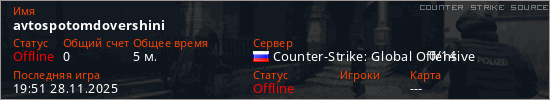 Играет на Counter Strike Source сервере. Страна: РоссияПервый раз замечен 18:55 28.11.2025