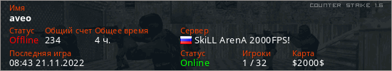 Играет на Counter Strike 1.6 сервере. Страна: РоссияПервый раз замечен 22:45 25.10.2022