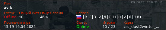 Играет на Counter Strike 1.6 сервере. Страна: РоссияПервый раз замечен 11:57 02.05.2024