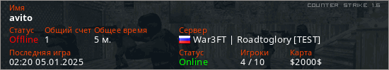 Играет на Counter Strike 1.6 сервере. Страна: РоссияПервый раз замечен 02:18 05.01.2025