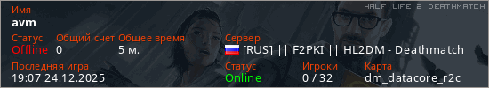 Играет на Half Life 2 DeathMatch сервере. Страна: РоссияПервый раз замечен 19:05 24.12.2025