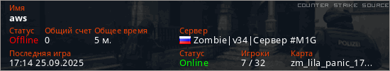 Играет на Counter Strike Source сервере. Страна: РоссияПервый раз замечен 17:12 25.09.2025