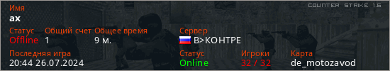 Играет на Counter Strike 1.6 сервере. Страна: РоссияПервый раз замечен 10:24 24.06.2024