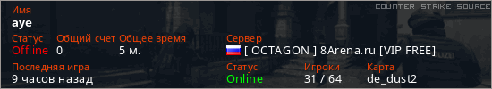 Играет на Counter Strike Source сервере. Страна: РоссияПервый раз замечен 13:20 20.12.2025