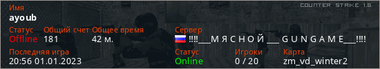 Играет на Counter Strike 1.6 сервере. Страна: РоссияПервый раз замечен 20:17 01.01.2023