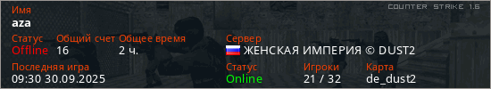 Играет на Counter Strike 1.6 сервере. Страна: РоссияПервый раз замечен 16:33 22.04.2022