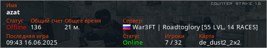 Играет на Counter Strike 1.6 сервере. Страна: РоссияПервый раз замечен 21:11 21.06.2024