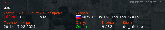 Играет на Counter Strike 1.6 сервере. Страна: РоссияПервый раз замечен 20:08 17.08.2025